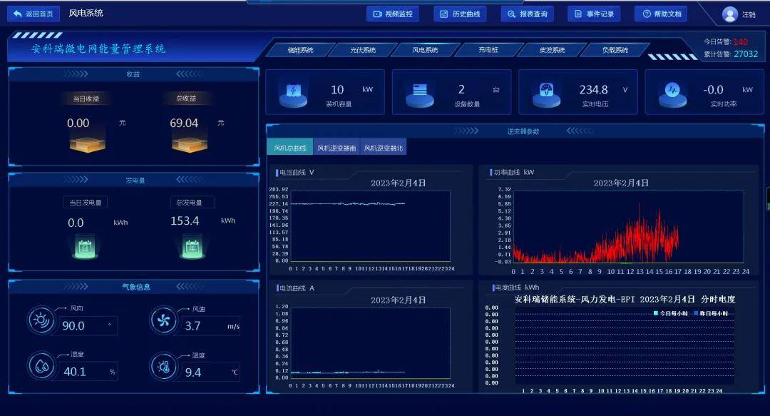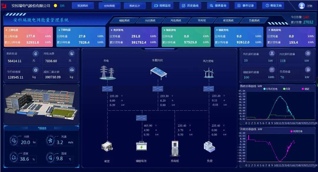 微电网能量管理系统包括系统主界面,包含微电网光伏、风电、储能、充电桩及总体负荷情况,体现系统主接线图、光伏信息、风电信息、储能信息、充电桩信息、告警信息、收益、环境等。
